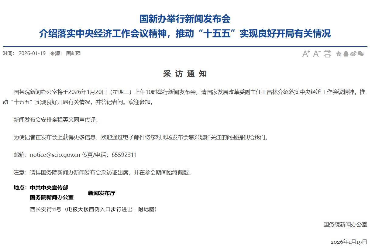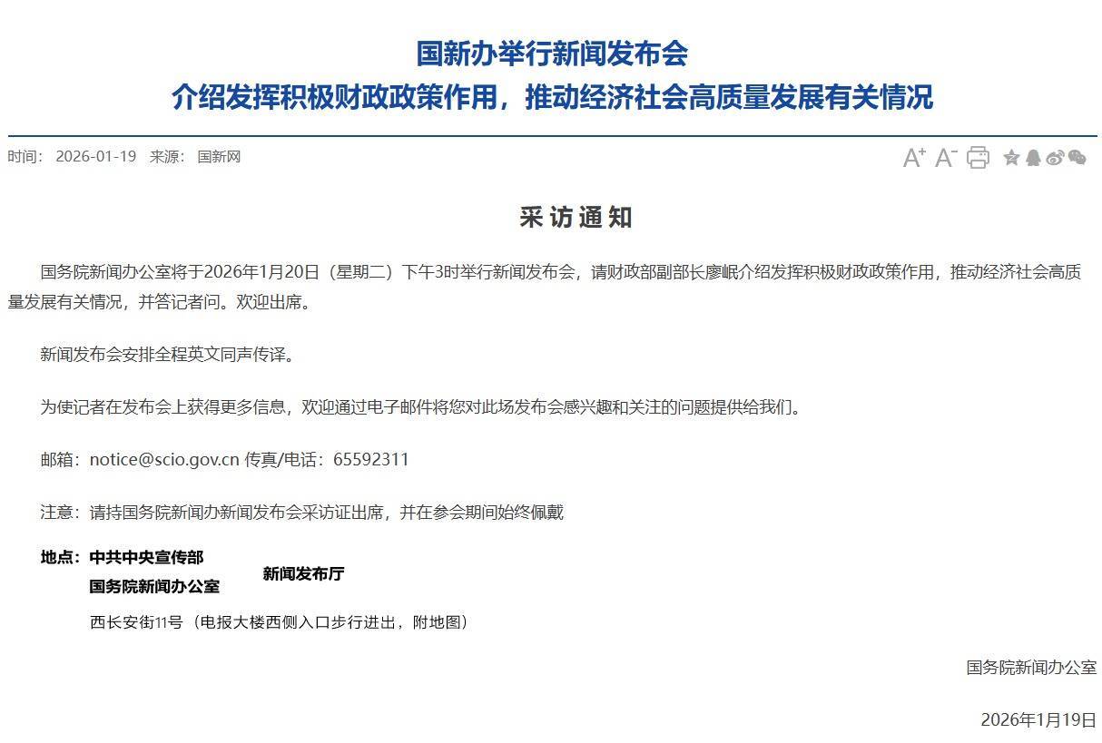 另外,国务院新闻办公室将于2026年1月20日(星期二)下午3时举行新闻发布会,请财政部副部长廖岷介绍发挥积极财政政策作用,推动经济社会高质量发展有关情况,并答记者问。
